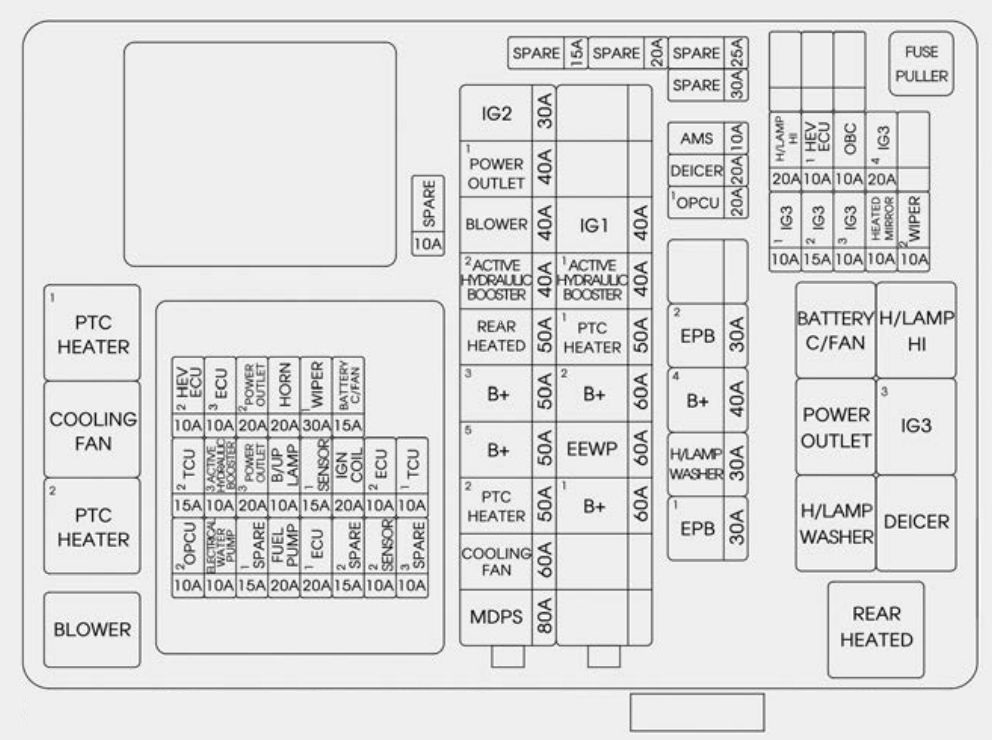 | IG1 | 25 | PCB Block (Fuse – OPCU2/ELECTRICAL WATER PUMP/TCU2/ACTIVE HYDRAULIC BOOTER 3/HEV ECU2/ECU3) |