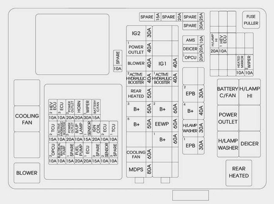 | HEV ECU 2 | 10 | HPCU, E/R Junction Block (Battery C/Fan Relay) | |