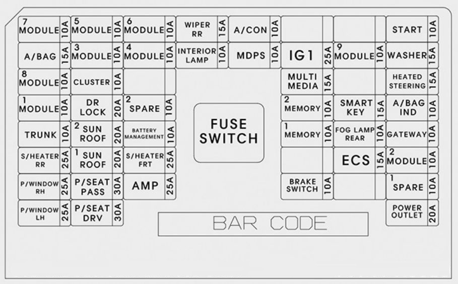 | B+4 | 40 | Smart Junction Block (Leak Current Autocut Device Fuse – INTERIOR LAMP, MULTI MEDIA, MEMORY2, MEMORY1, Fuse – MODULE1, DR LOCK, SMART KEY, BRAKE SWITCH) | |