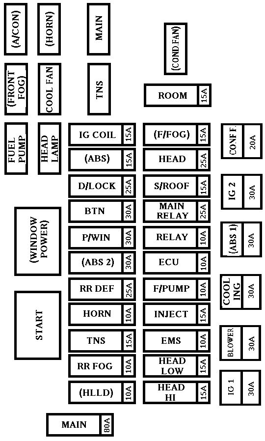 CIGAR – 10 A AUDIO – 10 A IG COIL – 15 A TURN LAMP – 10 A A/BAG – 10 A WIPER (RR) – 15 A WIPER (FRT) – 15 A RELAY – 10 A START – 10 A