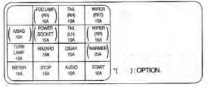 CIGAR – 10 A AUDIO – 10 A IG COIL – 15 A TURN LAMP – 10 A A/BAG – 10 A WIPER (RR) – 15 A WIPER (FRT) – 15 A RELAY – 10 A START – 10 A |