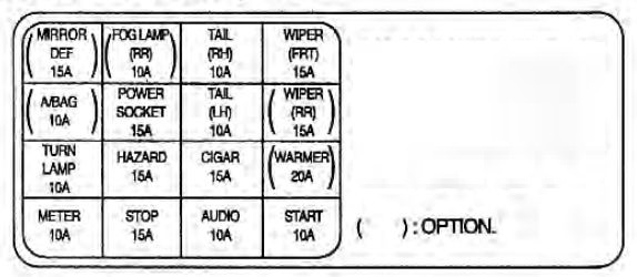 CIGAR – 10 A AUDIO – 10 A IG COIL – 15 A TURN LAMP – 10 A A/BAG – 10 A WIPER (RR) – 15 A WIPER (FRT) – 15 A RELAY – 10 A START – 10 A |