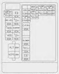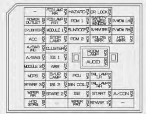 | B+2 | 50 | I/P Junction Box (Fuse : HAZARD 15A / PDM 1 25A / PDM 2 10A / SUNROOF 15A /DR LOCK 20A / SAFETY POWER WINDOW 25A / S/HEATER 2 15A, FOLD’G MIRR 10A / Power Window Relay) | |
