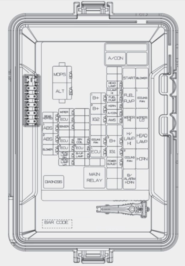 | B+2 | 50 | Instrument Panel Junction Block (Fuse – IMMO, SMART KEY, BRAKE SWITCH, SAFETY P/WINDOW, S/HEATER, SUNROOF, Power Window Relay) |