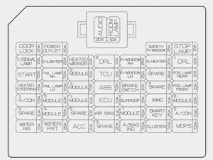 | ACC | 10 | Power Outlet Relay, BCM (Body Control Module), SLM (Seat Belt & Lighting Module), Audio, Key Interlock, Audio/Video & Navigation Head Unit, USB Charging Connector, Power Outside Mirror Switch, Smart Key Control Module |