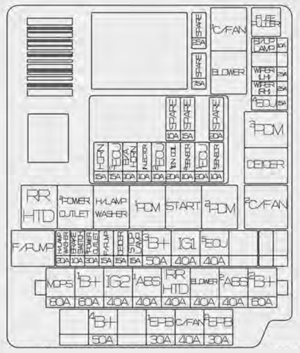 | 60 | IP_B+2 | Inner Fuse Panel, P/seat DRV, Spare3, Fog Lamp RR, IPS-5/Arisu-2 (H/Lamp Low LH, H/Lamp Hi LH, Turn FL/RL), IPS-6 (EXT Tail Lamp LH/RH) | |