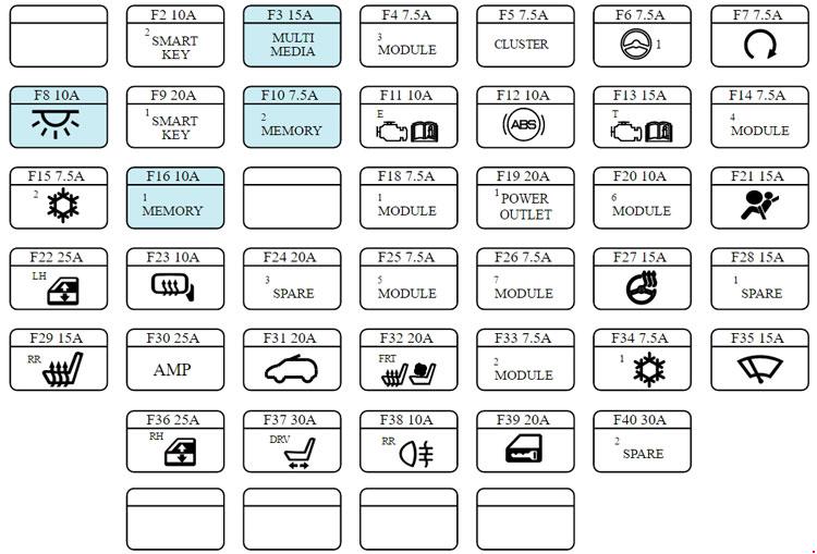 | F4 | 7.5 | MODULE 3 | Seat Warmer Control Module, Rear Seat Warmer Module, Passenger Seat Warmer Module, DC-DC Converter (AMP), Auto Head Lamp Leveling Device Module, Rain Sensor, Head Lamp Leveling Device Actuator LH/RH, A/C Control Module, Electro Chromic Mirror, Head Lamp Leveling Device Switch, AA/ Navigation Head Unit |