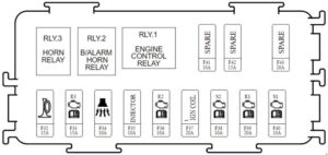 | F34 | 10 | B/ALARM | B/Alarm Horn Relay, Horn Relay |