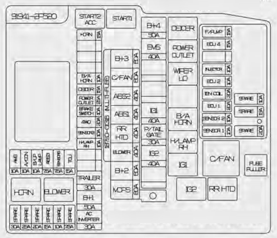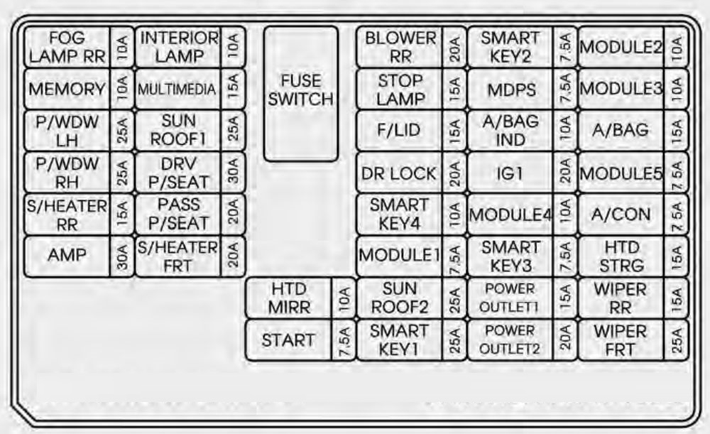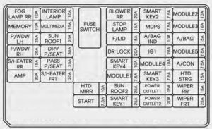 | I/P B+3 | 60 | SMART_KEY-1 25A, SMART_KEY-4 10A, MODULE-1 7.5A, SUNROOF-2 25A, (FUSE SW RLY, INTERIOR LAMP 10A : DR_SCUFF_LP_DRV, DR_SCUFF_LP_PASS, DR_WARNG_SW, S_VISOR_LP_LH/RH, OHC_LAMP, ROOM_LP, RL/RR_PERSONAL_LAMP, CARGO_LAMP, MULTIMEDIA 15A : Audio, A/V & Navigation Head Unit, MTS, MEMORY 10A : OBD_II, Front A/C Control Module, TPMS, Digital Clock, INSIDE_MIRR, S_WARMER_SW_LH/RH, AIR_VENT_SEAT_SW_LH/RH, CLUSTER, O_S_MIRR_SW, P_WDW_MAIN_SW, FRT_DRV_SEAT_EXT, P_WDW_PASS_SW) |