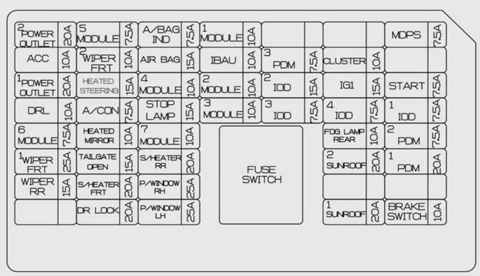| IOD1 | 7,5 | Overhead Console Lamp, Vanity Lamp LH/RH, Room Lamp, Glove Box Lamp, Luggage Lamp |