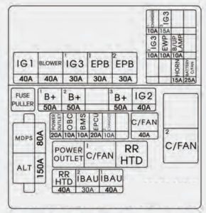 | B+3 | 50 | Smart Junction Block (Fuse – (PDM 1, PDM 2, BRAKE SWITCH, Leak Current Autocut Device) IPS1, Arisu-LT1) |