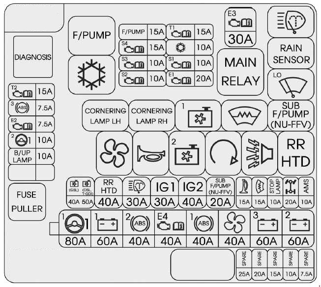 | F7 | 15 | SENSOR 4 | G4KD, G4KE, G4NA: R2 (Fuel Pump Relay), Oxygen Sensor Up/Down, E/R Fuse & Relay Box (R3 – Cooling Fan (Low) Relay, R9 – Cooling Fan (High) Relay) D4HA: Immobilizer Module, Rail Pressure Regulator Valve, Fuel Pressure Regulator Valve, RLY. 2 (Fuel Pump Relay) F4NA: RLY. 2 (Fuel Pump Relay), Oxygen Sensor Up/Down, ECM(M/T), E/R Fuse & Relay Box (RLY. 3 – Cooling Fan (Low) Relay, RLY. 9 – Cooling Fan (High) Relay, RLY. 11 – Sub Fuel Pump Relay), Cold Start Solenoid Valve D4FD, G4FD: RLY. 2 (Fuel Pump Relay), PCM, Oxygen Sensor Up/Down,E/R Fuse & Relay Box (RLY. 3 – Cooling Fan (Low) Relay, RLY. 9 – Cooling Fan (High) Relay) |