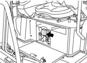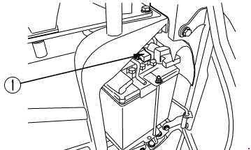 If the starter does not run when the ignition switch is turned to position ON, the fuse (1) may have blown. Open the cover on the left side of the machine to check the fuse and change it if necessary. The main fuse is positioned on the battery.