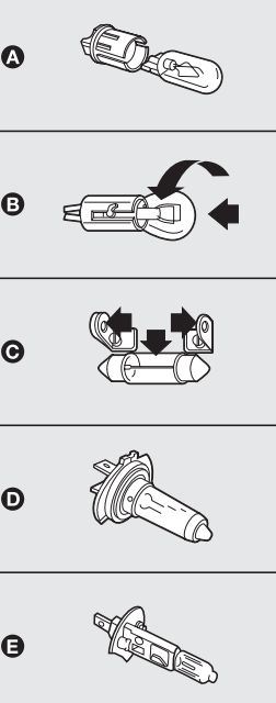 B – Bayonet type bulbs: press the bulb, turn counterclockwise to remove this type of bulb from its holder