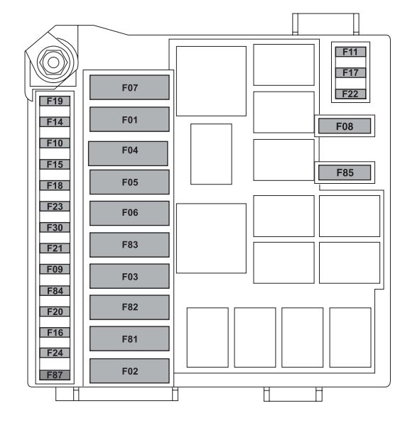 | Supply from SCM main relay for ECU (versions 0.9 TwinAir 85 HP/1.3 16V MultiJet) | F22 | 15 |