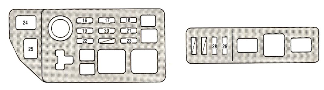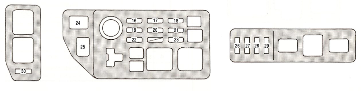 | 8 | CIG/RADIO | 15 | Radio, cassette tape player, compact disc player, power antenna, power rear view mirrors, cigarette lighter, theft deterrent system, shift lock system, SRS airbag system, clock |