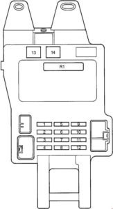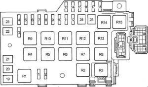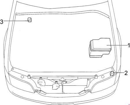 | 23 | ALT | 100 | Taillight relay, generator (alternator), “FOG”, “AM1”, “HEATER”, “DEFOG”, “ABS”, “STOP”, “SRS”, “POWER” fuses |