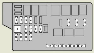 | 7 | PANEL | 7,5 | Steering switch illumination, Audio system, Glove box light, Automatic transmission selector lever illumination, Console box light, Adaptive variable suspension switch illumination, Cigarette lighter illumination, Air conditioning system, VSC off switch illumination, Driving pattern selector switch, Seat heater or Heated and ventilated seat switches, Register ILL RH, Register ILL LH,Register ILL CTR |