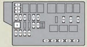 | 17 | ECU-IG RH | 10 | Power seats, smart access system with push-button start, outside rear view mirrors, VDIM, air conditioning system, pre-collision seat belt, electric tilt and telescopic steering, power windows, navigation system, headlights, front fog lights, parking lights, license plate lights, windshield washer |