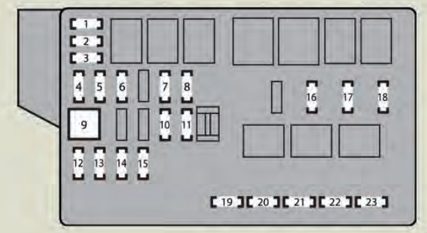 | 9 | ACC | 7,5 | Clock, air conditioning system, audio system, navigation system, display, outside rear view mirrors, smart access system with push-button start, glove box light, console box light |