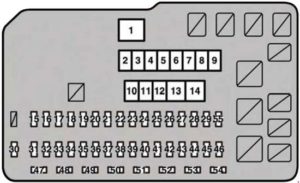 | 20 | ECU-IG1 NO. 2 | 10 | 2010-2012: Air conditioning system, multiport fuel injection system/sequential multiport fuel injection system, SRS airbag system, multi-information display 2013-2015: Intuitive parking assist, AWD system, pre-collision seat belt |