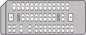 | 26 | ECU-BNO. 2 | 7,5 | 2010-2012: Air conditioning system, front passenger occupant classification system, starter system 2013-2015: Air conditioning system, front passenger occupant classification system, audio system, vehicle stability control system, power windows |