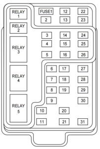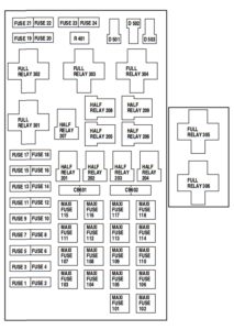 | 23 | 10 | Trailer tow battery Charge relay, Turn/Hazard flasher, 4×4 solenoids, 4×4 relays, Overhead console, 4–Wheel Anti-lock Brake System (4WABS) module, EC mirror, Heated seats |