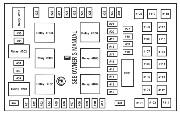 | 10 | 20 | Trailer tow back-up lamps relay (PCB1), Trailer tow park lamp relay (R201) |