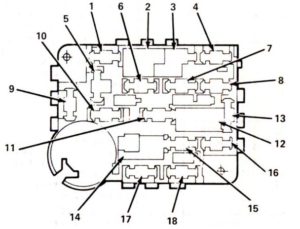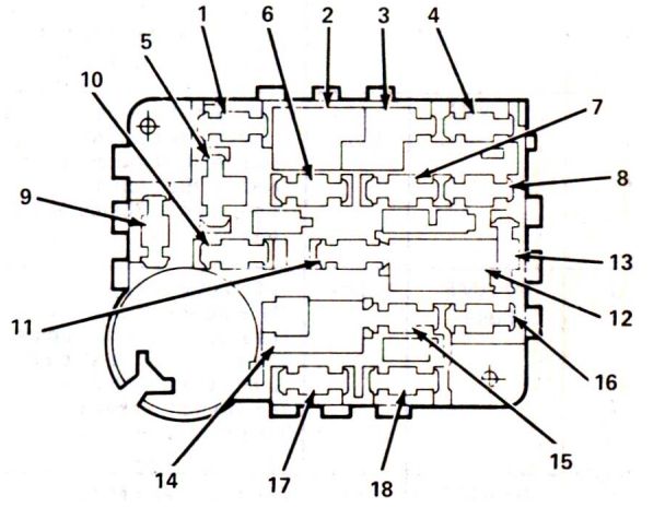 | 18 | 10 | Warning Indicator Lights, Auto Light System & Electronic Chimes, Day/Night Mirror & Low Oil Level Relay, Throttle Solenoid Positioner, Message Center (1984-85), Flash-to-Pass (1984-89) |