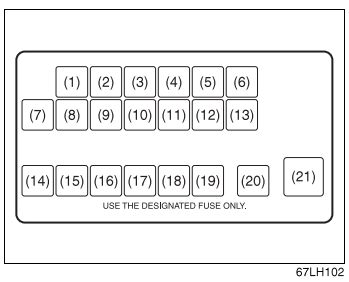 KIA Sportage (2000) – fuse box diagram Year of production: 2000 Engine compartment Description Ampere rating [A] Protected component FUEL INJ 30 Fuel injection system ADD 30 A/C condenser fan MAIN 80 For protection of […]