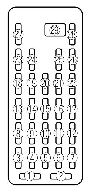 | 10 | BTN | 60 | STOP, ROOM and D/LOCK fuses, Fuel lid opener, Power door lock |