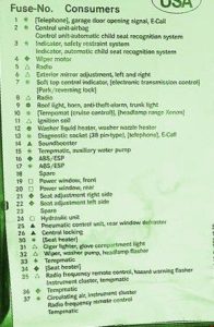 | 37 | Diagnosis (OBD II) Radio frequency remote control Instrument cluster Automatic heater (HEAT): Heater pushbutton control module (HEAT) A/C control module (Tempmatic A/C) Fresh/recirculated air flap switchover valve |