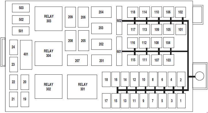 | 8 | 25 | ’03-’04: Powertrain Control Module (PCM) power relay, Coil-on plugs, Radio noise capacitor, Passive Anti-Theft System (PATS) |