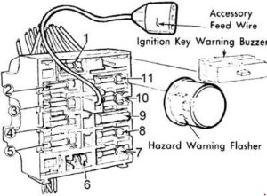 Courtesy lamps, instrument panel, door, dome, glove box, cargo (station wagon only), & luggage compartment lights, clock feed, door lock solenoid, key warning buzzer, seat back latch relay control, anti-theft system, lighted visor vanity