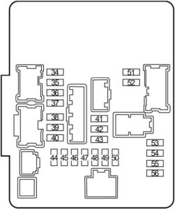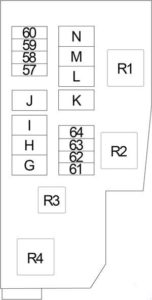 | E | 80 | Engine Control Module Relay (Fuse: “38”, “39”, “40”), Ignition Relay 1 (A/C Relay, Cooling Fan Relay 1, Fuse: “44”, “45”, “46”, “47”, “48”, “49”, “50”), Fuse: “53”, “55”, “56” |