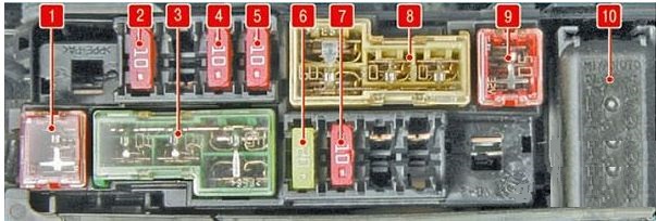 Year of production: 2002, 2003, 2004 Fuse boxes in the front luggage compartment Fuse box A Fuse location Ampere rating [A] Function MF1 40 Right-hand fan MF2 30 F1 Pump MF3 80 Front fuse box […]