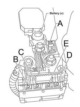 | B | 60 | Ignition 1 Relay (Front Wiper High Relay, Cooling Fan High Relay, Cooling Fan Low Relay, A/C Relay, “48” fuse), “52”, “53” fuses |
