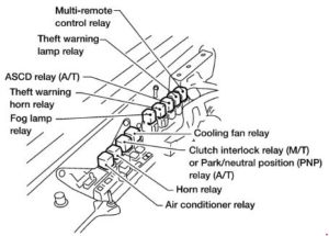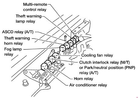 | 7.5 | ’99-’00: ASCD Brake Switch (Shift Lock Brake Switch), Theft Warning Relay, SECU, ASCD Main Switch, Warning Chime Unit, Power Window Relay, Daytime Light Control Unit | |