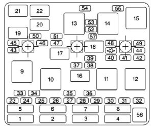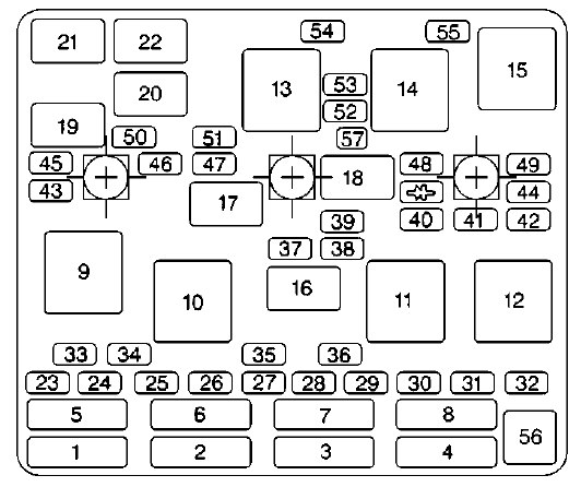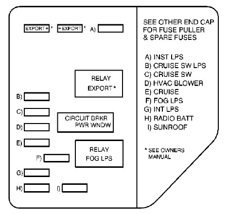 | 2 | Right Electrical Center-Fog Lamps, Radio, Body Function Control Module, Interior Lamps |