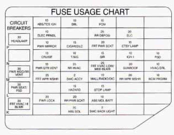 | 5 | IGN MAIN 1 | Ignition Switch to Fuses (UP): ABS/TCS IGN, CRUISE, DRL, ELEC PRNDL, IGN 1, PSD, SIR, T/SIG and PCM [IGN MAIN Relay (Underhood Electrical Center Fuses: A/C INJ, TCC)] CLU, ELEK |
