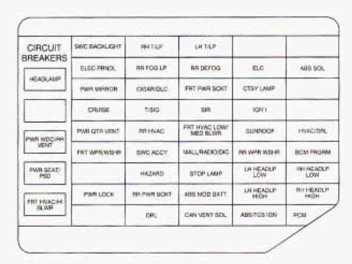 | 3 | HEADLAMP | Circuit Breakers: FRT HVAC HI BLWR, and HEADLAMP Fuses (VP): HAZARD and STOPLAMP |