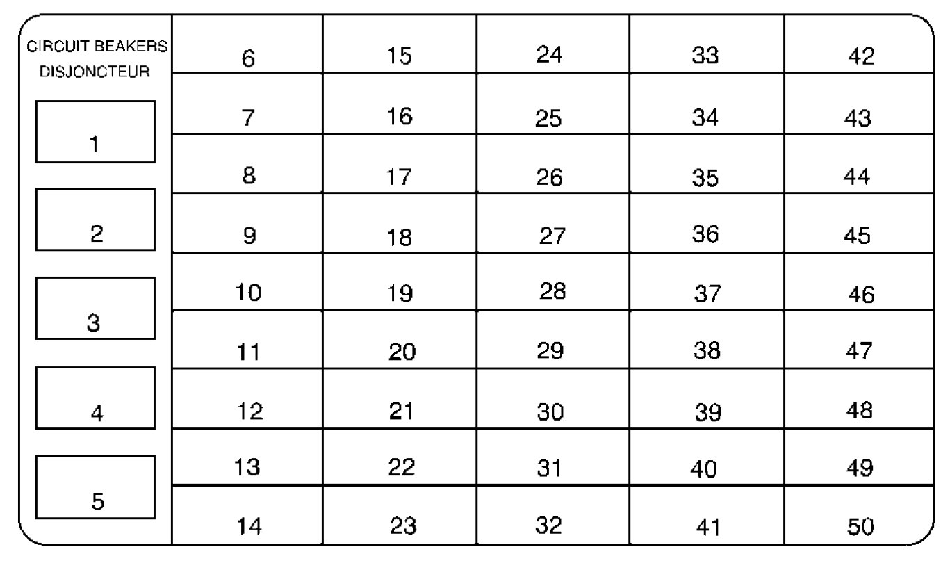 | 7 | BATT MAIN 1 | Fuses (Instrument Panel): ABS MOD BATT, CIGAR/DLC, CTSY LAMP, FRT PWR SCKT, PWR LOCK, PWR MIRROR and RR PWR SCKT |