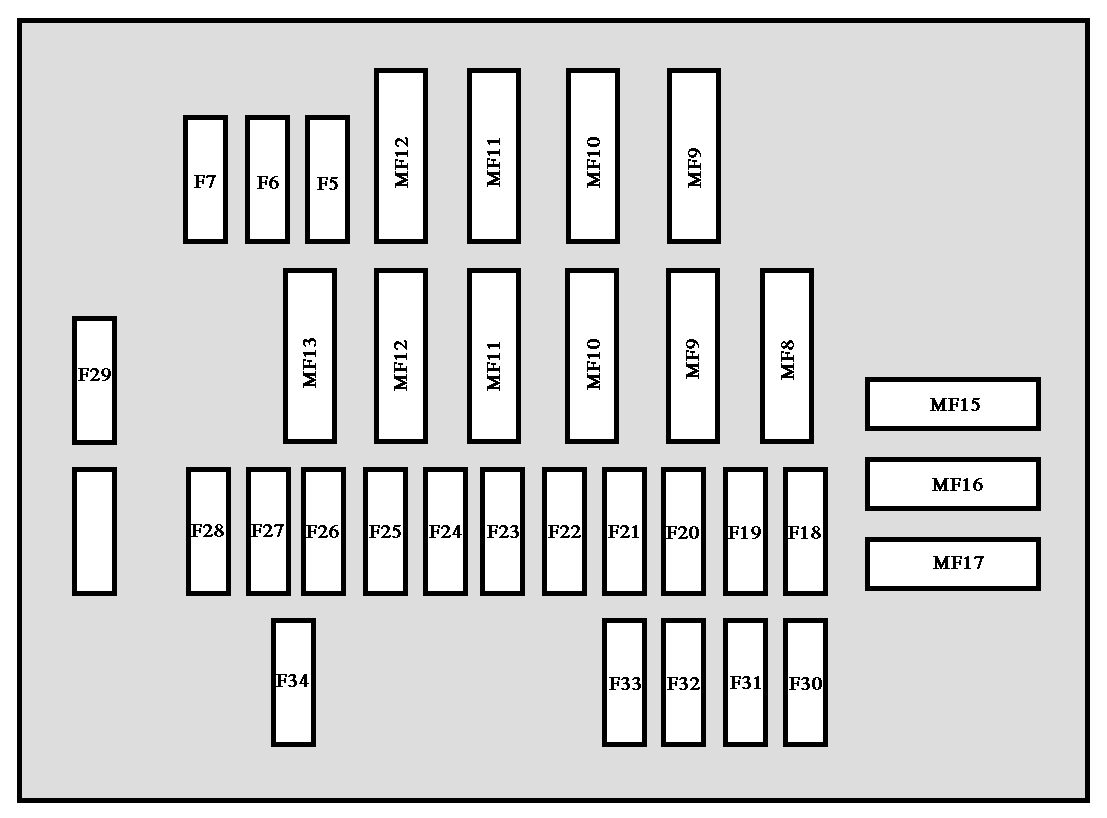 | F34 | 5 | Oxygen sensors – Exhaust gas recirculation solenoid valve, Exhaust gas recirculation throttle solenoid valve – Turbo pressure regulation solenoid valve |