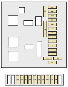 | F1 | 20 | Fan assembly relay control, engine control unit power relay |