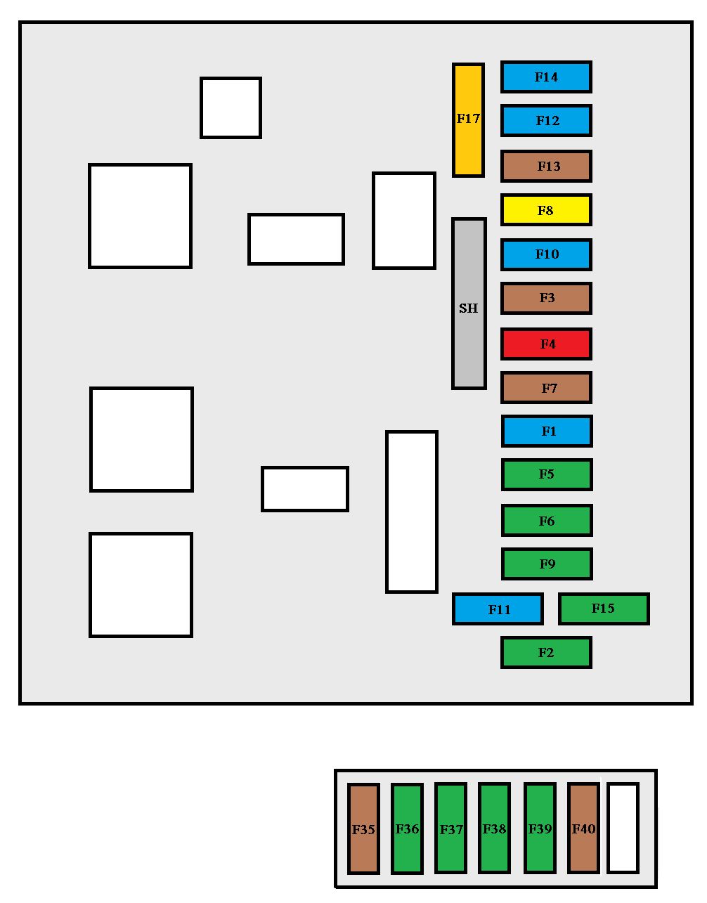 | F1 | 20 | Fan assembly relay control, engine control unit power relay |