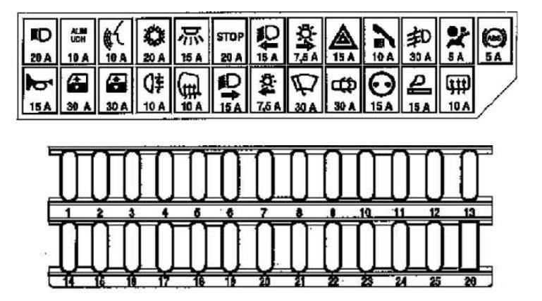 | F20 | 7,5 | Left-hand side light – Lighting dimmer and glove box – Registration plate lighting -Cigarette lighter lighting – Switch lighting except doors and hazard warning lights – Parking brake control lighting |