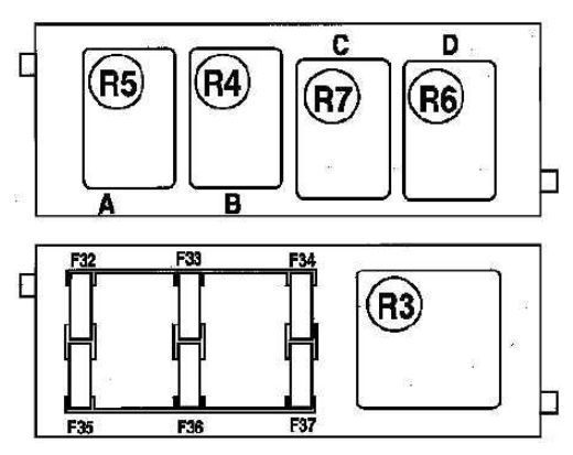 | F4 | 20 | Reversing lights – Heating and air conditioning – Parking aid – + After ignition alarm signal – Switch control lighting – Rain sensor – Electrochrome door mirrors – Air conditioning compressor – Wiper motor signal |