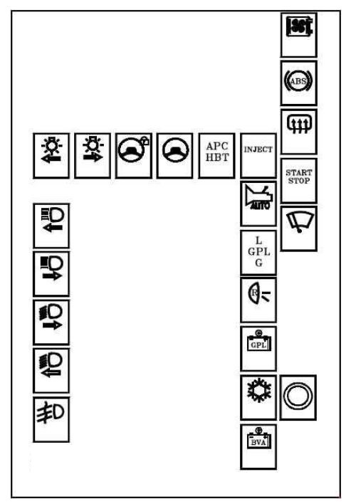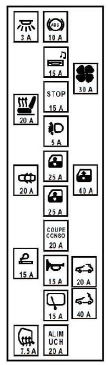 | F7A | 7,5 | Right-hand side light – cruise control stop/start control – ESP stop/start button – gear selector lever display – left-hand heated seat control – right-hand heated seat control – rigid roof switch – windscreen simultaneous control – LPG or petrol selector switch |