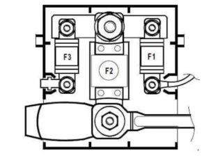 | F2 | 350 | Petrol engines: + protected starter battery – alternator – power feed fuse board – switching and protection unit |
