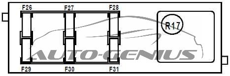 | F50 | 20 | Consumer cut-out fuse: Diagnostic socket – Radio – Air conditioning control unit – Seat memory computer – Clock/external temperature/radio display unit – Navigation computer – Tyre pressure computer – Central communication unit – Alarm connection – Seat memory |